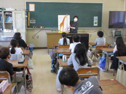 質問が終わると巨大絵本「どうぶつしんちょうそくてい」の読み聞かせがありました。キリンの挿絵が出た瞬間、児童から歓声がわき起こりました!