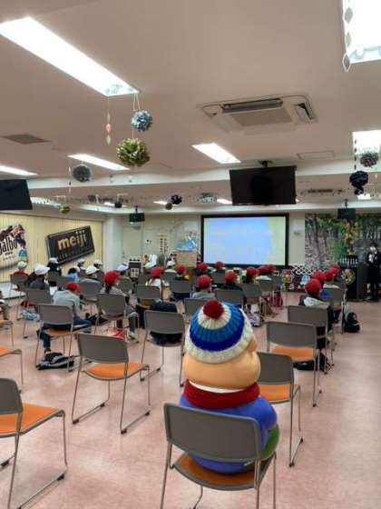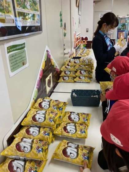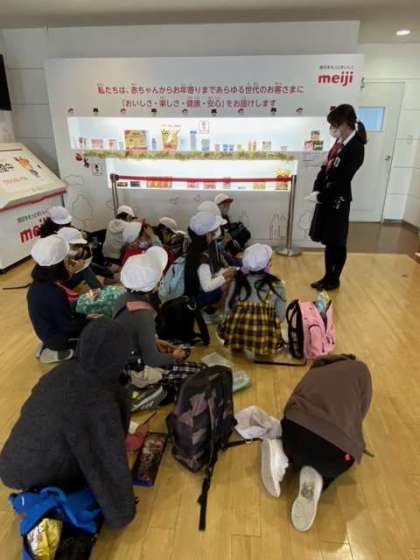 お話の後は、いよいよ工場見学です。たけのこの里と、きのこの山の製造ラインを見せていただきました。製造工程はもちろん企業秘密ですので撮影はできませんでしたが、子どもたちは興味津々で見学していました。