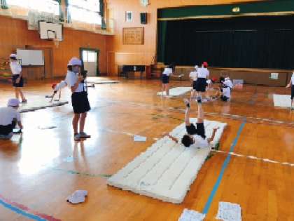 学習の前には、技ごとに“手の位置を意識する”や“つま先までしっかり伸ばす”などの目標をもって取り組んでいます。