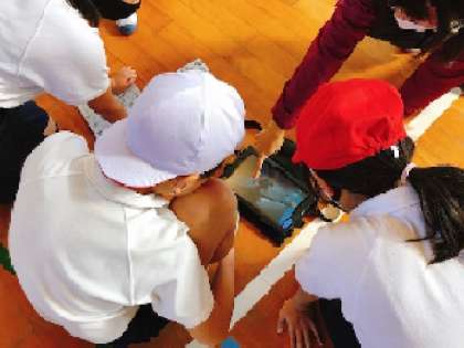 技をするときには、友だちにタブレットで動画を撮ってもらい、自分で確認をします。