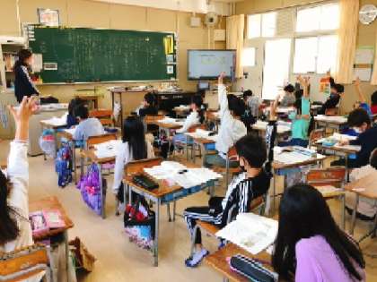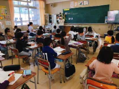 2組は算数科で、長方形や正方形の紙を半分に切ってできる三角形の形を調べました。