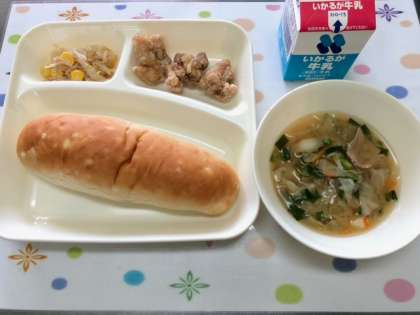 今日の給食は、けい肉のからあげ・中華みそスープ・もやしとコーンのあまずあえ・おさつパン・牛乳です。