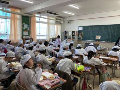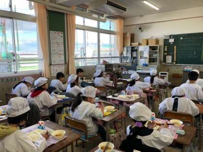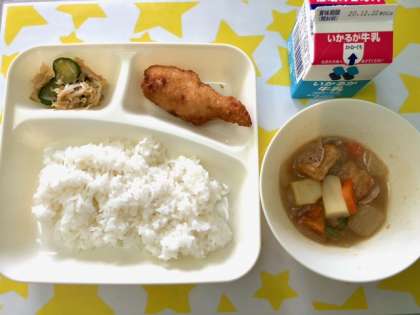 今日の給食は、たらのフライ・ぶたにくとあつあげの煮もの・もやしときゅうりのおひたし・ごはん・牛乳です。
