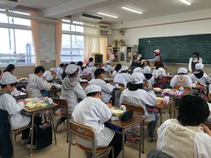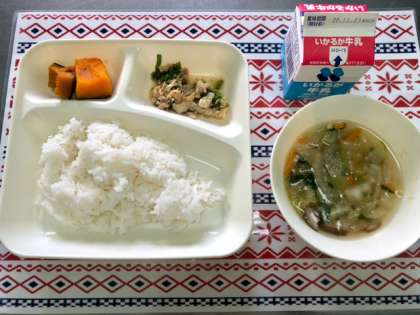 今日の給食は、ぶたにくとほしずいきのみそ煮・すまし汁・焼きかぼちゃの甘みつかけ・ごはん・牛乳です。
