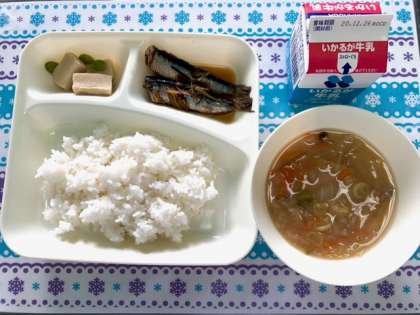 今日の給食は、いわしのしょうが煮・みそしる・高野どうふの煮もの・ごはん・牛乳です。