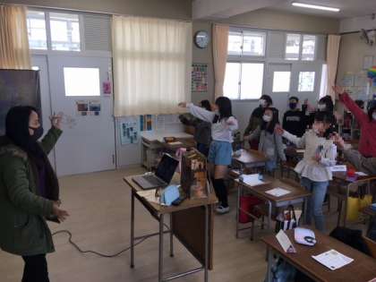 その後、Red,Blue,Yellow,Greenチームに分かれて、英語の曲の指示で立ったり座ったりしました。後半は英語の曲がスピードアップして、あわてながらも笑顔いっぱいの教室でした。