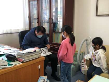 今日は2年生の先生方と相談して『かけ算の九九テスト』を実施しました。2年生の児童に校長室に来てもらい、出題は3問です。
