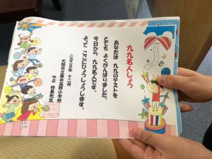 『合格だよ…おめでとう』と声をかけ『九九名人しょう』を渡すと途端ににこやかな表情になります。