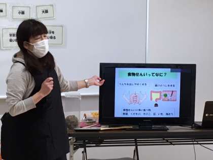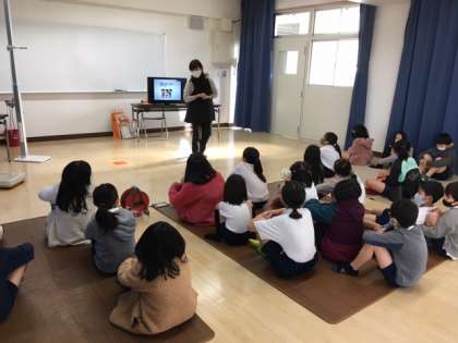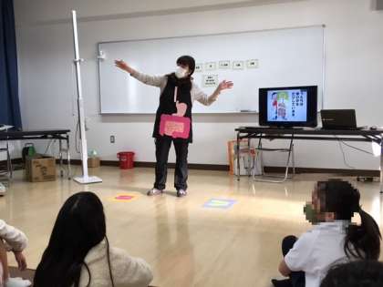 測定前に保健室の森本先生から保健指導がありました。早寝早起き、朝ごはん、毎朝の排便の大切さについての話の後、排便と食べたものや体調との関係をエプロンシアター形式の楽しいお話と映像でしっかり学びました。