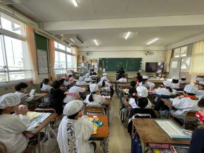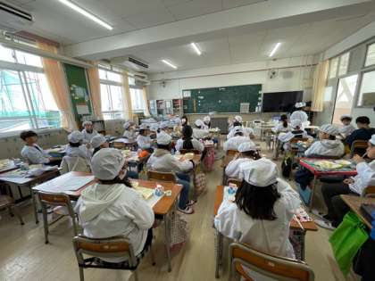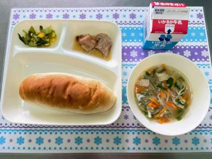 今日の給食は、けいにくのオイスターソース焼き・中華スープ・チンゲンサイとコーンの中華和え・おさつパン・牛乳です。