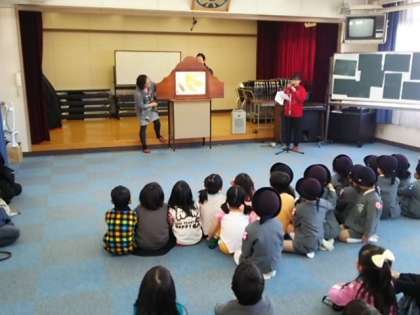 本校1年生の児童が一緒になって、朝の読み聞かせ隊(本校保護者が中心)による紙芝居を見ました。