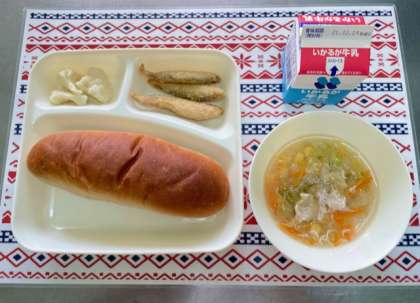 今日の給食は、わかさぎフライ・はくさいのスープ・カリフラワーのサラダ・黒糖パン・牛乳です。