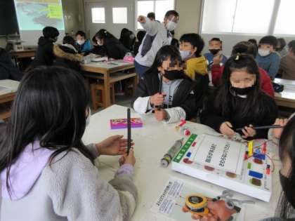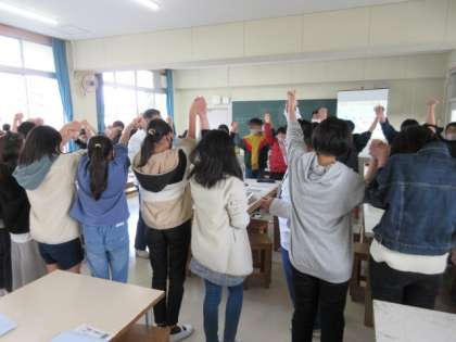 そして、、、最後はテレビでよく見かける、恒例(?)のみんなで手をつないで静電気を流す実験でした。初めての体験に児童は大喜びでした!!!