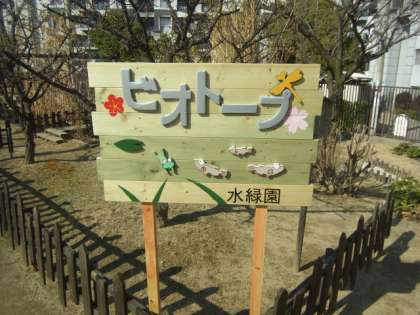 管理作業員さんがビオトープの生き物を木材から切り取って作りました。トンボ、蛙、梅や桜の花が楽しそうに看板を彩っています。