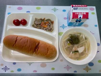 今日の給食は、ぶたにくとごぼうの煮もの・なにわうどん・プチトマト・黒糖パン・牛乳です。