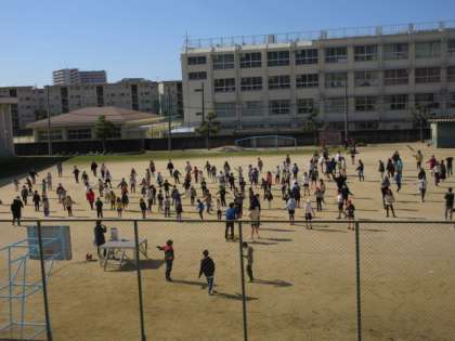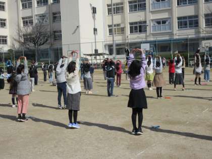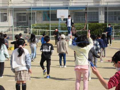 運動委員会がお手本を見せてくれた後は、それぞれ自由な跳び方を練習しました。最後は久しぶりの「ひがっち」で身体をほぐしました!