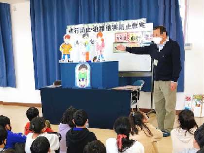 人形劇を通して考えました。また、万引きをしないために、万引きをした時の家族や被害者の気持ちを考えること、誘われたときに断る勇気を持つこと、ルールを守ることの大切さについて学習をしました。