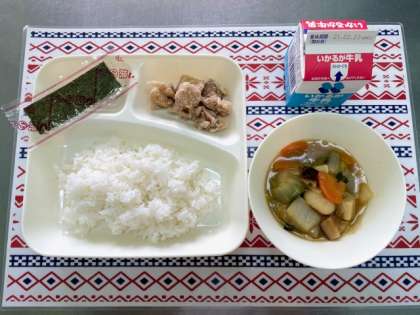 今日の給食は、けいにくのから揚げ・まる天と野菜のうま煮・焼きのり・ごはん・牛乳です。