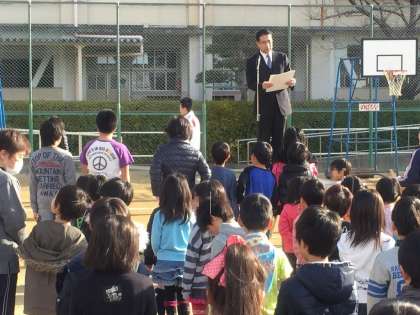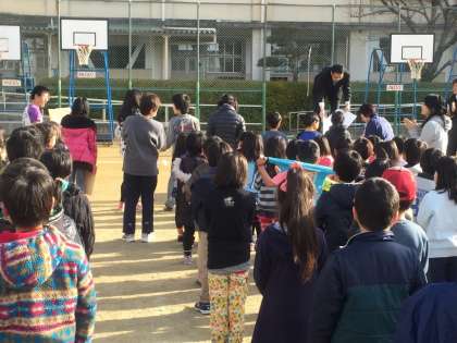 月曜日であり、朝は児童朝会でした。なかよし学級の図工展の表彰がありました。みんな表彰状をもらってうれしそうでした。また、体育主任の先生より、今日からのなわとび週間についてのお話がありました。