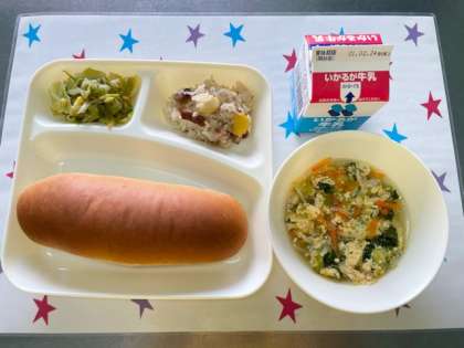今日の給食は、中華おこわ・たまごスープ【鶏卵】・キャベツとピーマンのいためもの・黒糖パン・牛乳です。