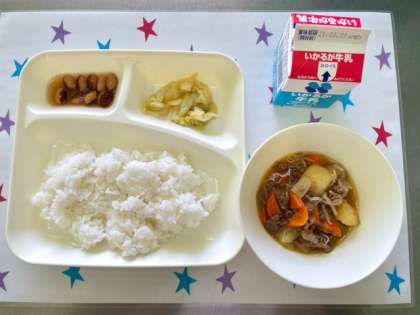 今日の給食は、肉じゃが・はくさいのゆず風味・とら豆の煮もの・ごはん・牛乳です。