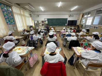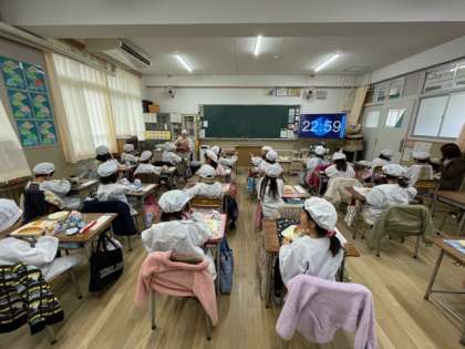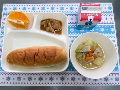 今日の給食は、けいにくのみそバターソース・スープ煮・デコポン・おさつパン・牛乳です。