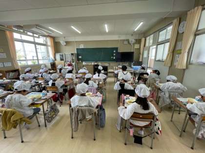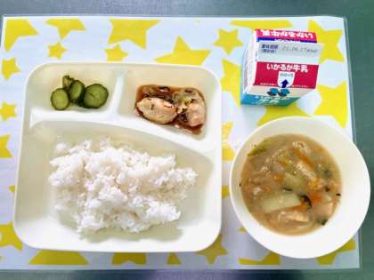 今日の給食は、やきとり・みそしる・きゅうりのゆず風味・ごはん・牛乳です。