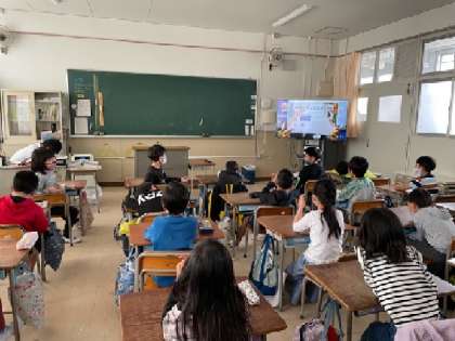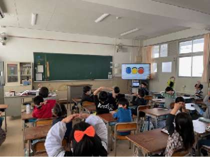 東淀川警察署の交通課の方が、交通安全教室のために来てくれました。テレビ放送を使って、安全に歩く方法や自転車に乗るときのきまりを教えてくれました。〇×クイズで考えることができて、子どもたちはとても楽しく安全について学ぶことができました。