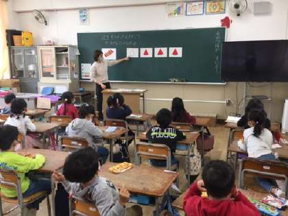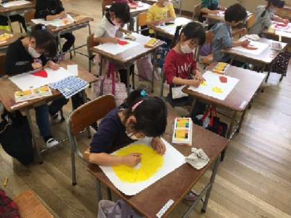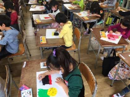 初めてクレパスを使って絵を描きました。最初に先生のお手本を見ながら説明を聞き、好きな食べ物などを描きました。色をしっかりと塗って、おいしそうな食べ物がたくさん描けていました。