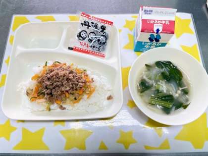 ビビンバは、きゅうりやにんじん、切り干し大根とひき肉をごはんと混ぜ合わせて食べる料理で、ごはんが進み大好評でした。