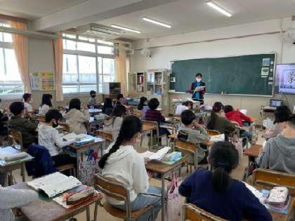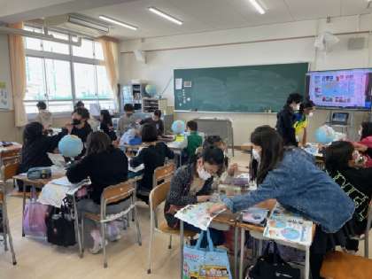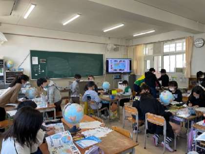2組は、社会科で世界の国々について学習しています。地球儀を見ながら、どんな国があるのか、みんなで考えています。