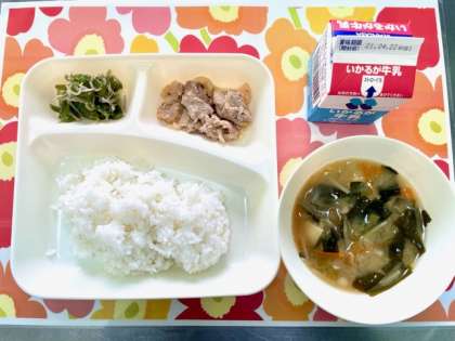 今日の給食は、ぶた肉のしょうが焼き・みそ汁・じゃこピーマン・ごはん・牛乳です。