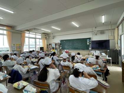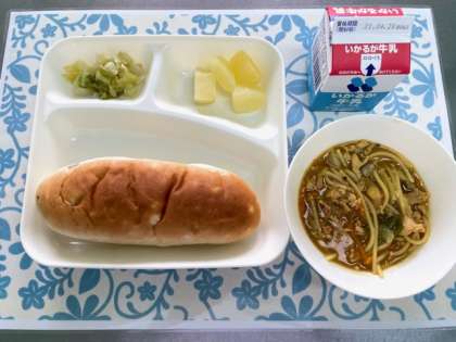 今日の給食は、カレースープスパゲッティ・キャベツのピクルス・りんご(カット缶)・おさつパン・牛乳です。