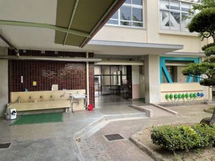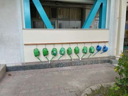 玄関近くの水道周りがきれいになりました。じょうろを置く場所を管理作業員さんが作ってくださいました。整理整頓がされていて、使いやすくなりました。みんなで水をやって、色々な作物が元気に育つといいですね。