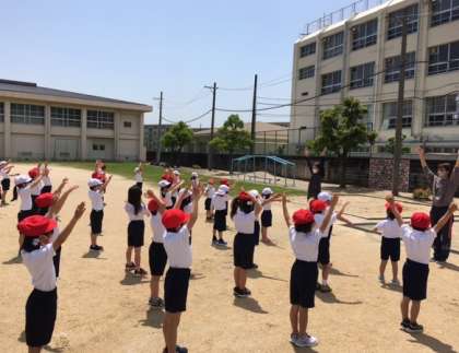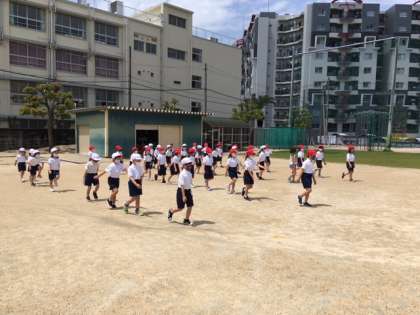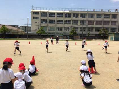 今日の3時間目、1年生は学年全員そろって運動場で運動しました。