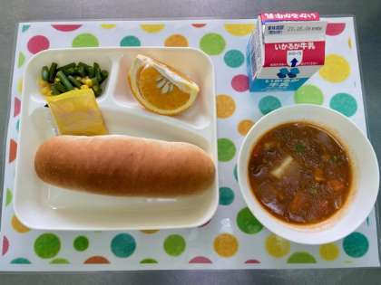 今日の給食は、ビーフシチュー・さんどまめとコーンのサラダ・あまなつかん・大型コッペパン・牛乳・アプリコットジャムです。