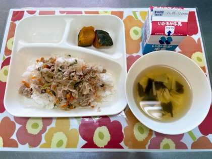 今日の給食は、ぶたどんぶり・ゆばのすまし汁・かぼちゃのしょうゆ焼き・ごはん・牛乳です。