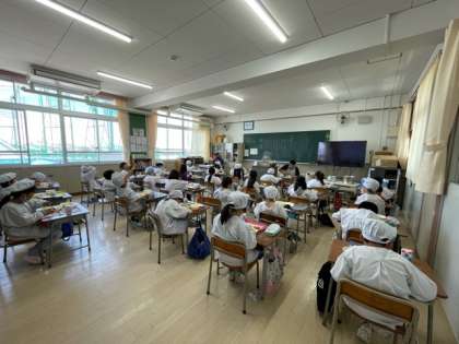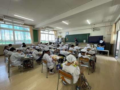 ぶたどんぶりは、ぶたにくや玉ねぎ、糸こんにゃく、青ねぎなどが入った具だくさんのどんぶりで、ごはんが進みおかわりをする児童がたくさん見られました。