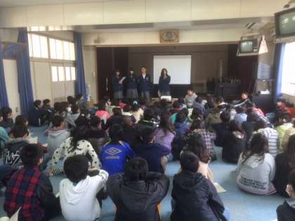 3月2日(月)の6時間目、多目的室で小中交流会が行われました。井高野中学校からは、先生と生徒4名が来校しましたが、生徒たちは本校の卒業生で、現在は中学校の生徒会で活躍しています。この交流会では、中学校についての様々な情報が児童に伝えられました。児童たちは、中学校についての疑問や質問を先輩たちにぶつけていました。