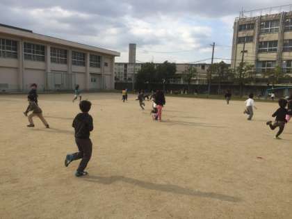 運動場全体を使って宝探しでした。すみずみまで、みんな宝を真剣に探していました。