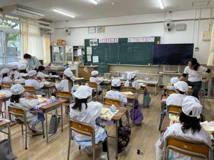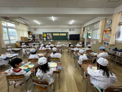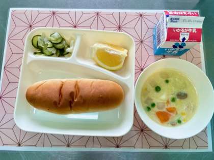 今日の給食は、コーンクリームシチュー・キャベツときゅうりのサラダ・かわちばんかん・レーズンパン・牛乳です。