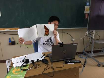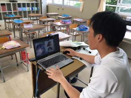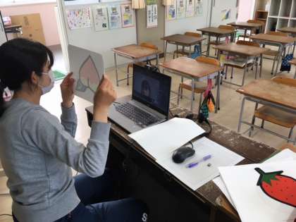 午後4時からのテストでは、画面を通しての会話や担任の示した絵を使ったクイズをして各担任と子どもたちがつながることができました。