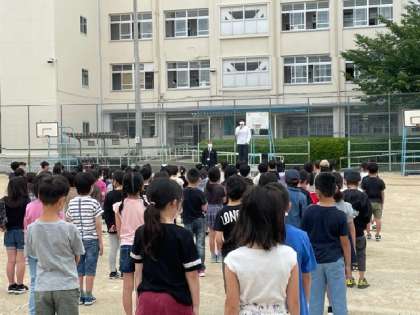 今日から通常授業が再開されました。久しぶりに運動場で児童朝会が行われています。通常授業にはなりましたが、感染症対策はまだ必要です。手洗いや、マスクを忘れずに元気に今週も過ごしましょう。