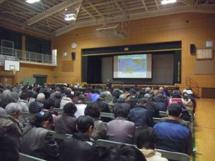 講堂には、300名あまりの地域の住民が集まり、東井高野地域の防災についての講演を熱心に聞き入っていました。