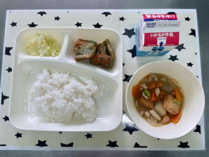 今日の給食は、ちくわのいそべあげ・あつあげと里芋の煮もの・あっさりキャベツ・ごはん・牛乳です。