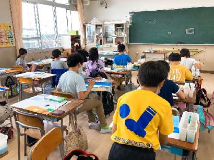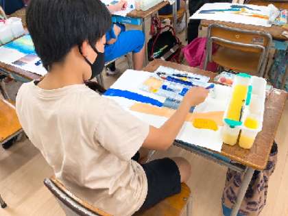 図工の時間に絵の具を使って絵を描きました。1枚の絵を見て、それぞれが想像をふくらませながら描いています。