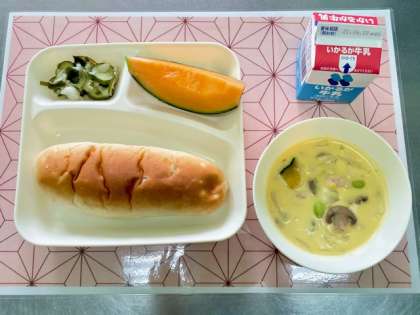 今日の給食は、かぼちゃのクリームシチュー・ミックスの海藻サラダ・クインシーメロン・おさつパン・牛乳です。