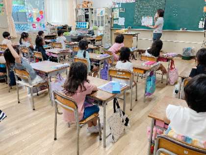 1組では生活の時間に、去年の1年生が作った学校紹介を見て、学校にどんな部屋があったかの復習をしました。