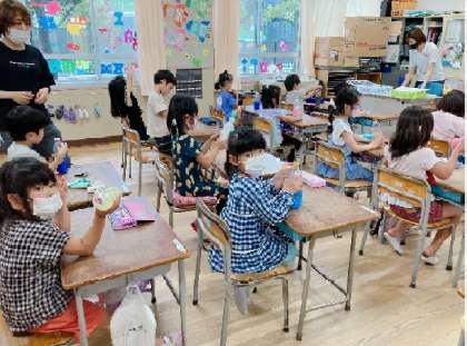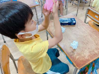 2組ではこどもフェスティバルで使う道具の準備を行いました。ペットボトルに水と絵の具を入れて、ペットボトルを振ると色水の完成です。それぞれどんな色になったか皆さん興味津々でした。