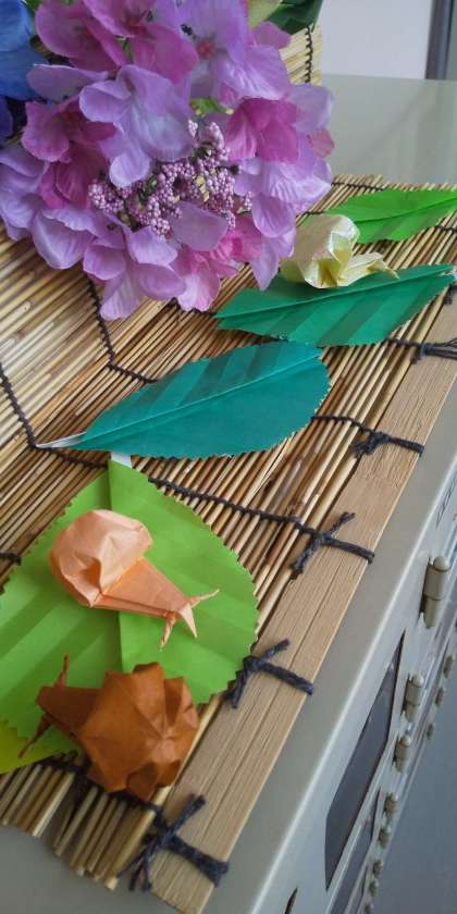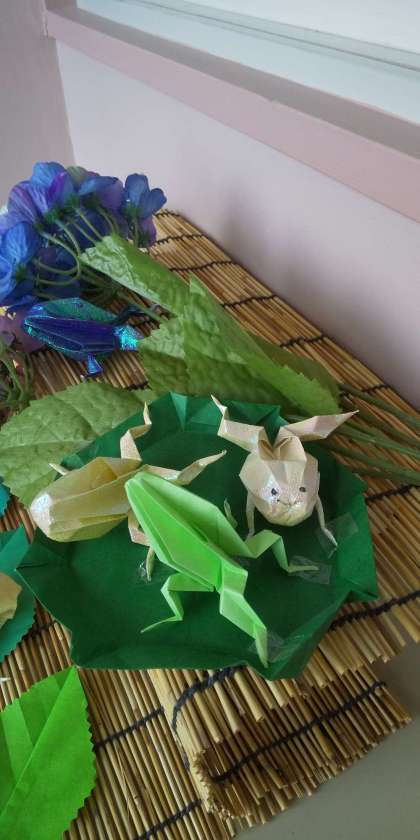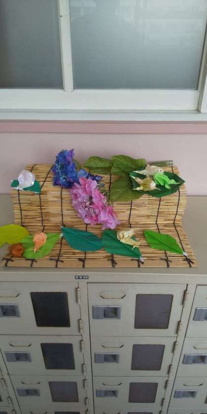 梅雨の掲示です。カエルやカタツムリは折り紙です。